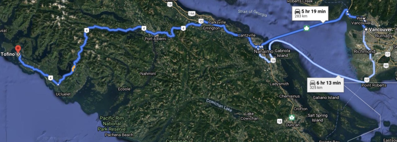 Tofino is a small peninsula located on the South end of Vancouver Island. It is only accessible via a ferry from the mainland of Vancouver. After the two-hour ferry ride, visitors will then have to drive three hours across the island to arrive in Tofino. Tofino can also be accessed via floatplane. The peninsula is about 10.53 km². Below is a map that shows where Tofino is relative to Vancouver. As of 2016, the population of full-time local residents was 1,932. Although, the District of Tofino has projected that there could be up to 2,500 residents by the end of 2020.
