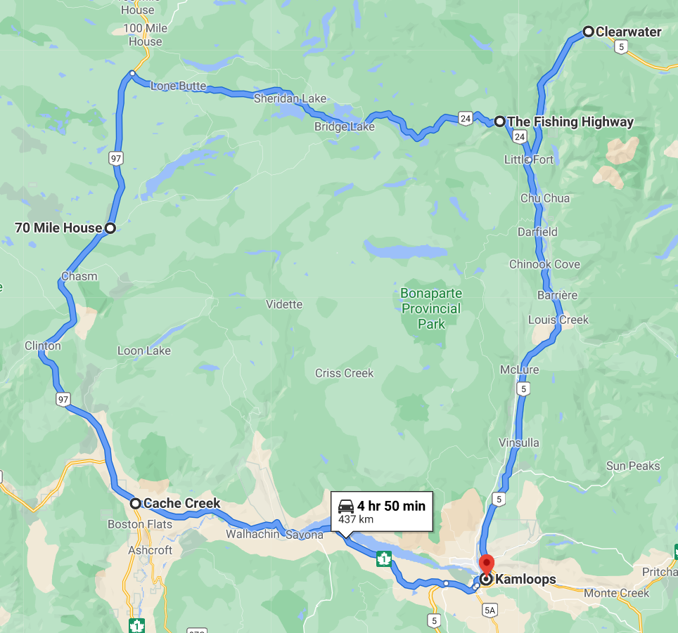 From Clearwater, you will want to travel back down Highway 5 to Little Fort. From there, you will continue onto Highway 24.